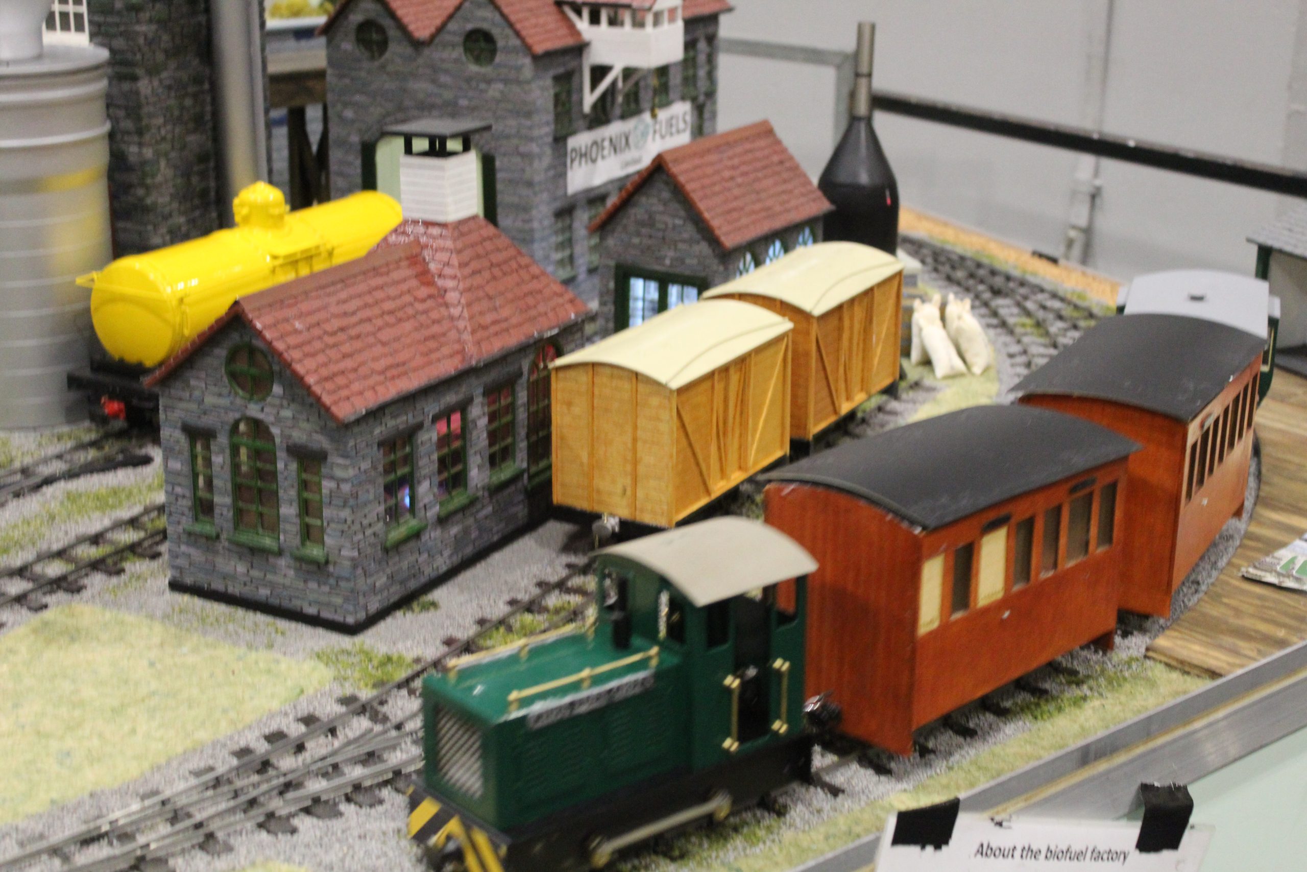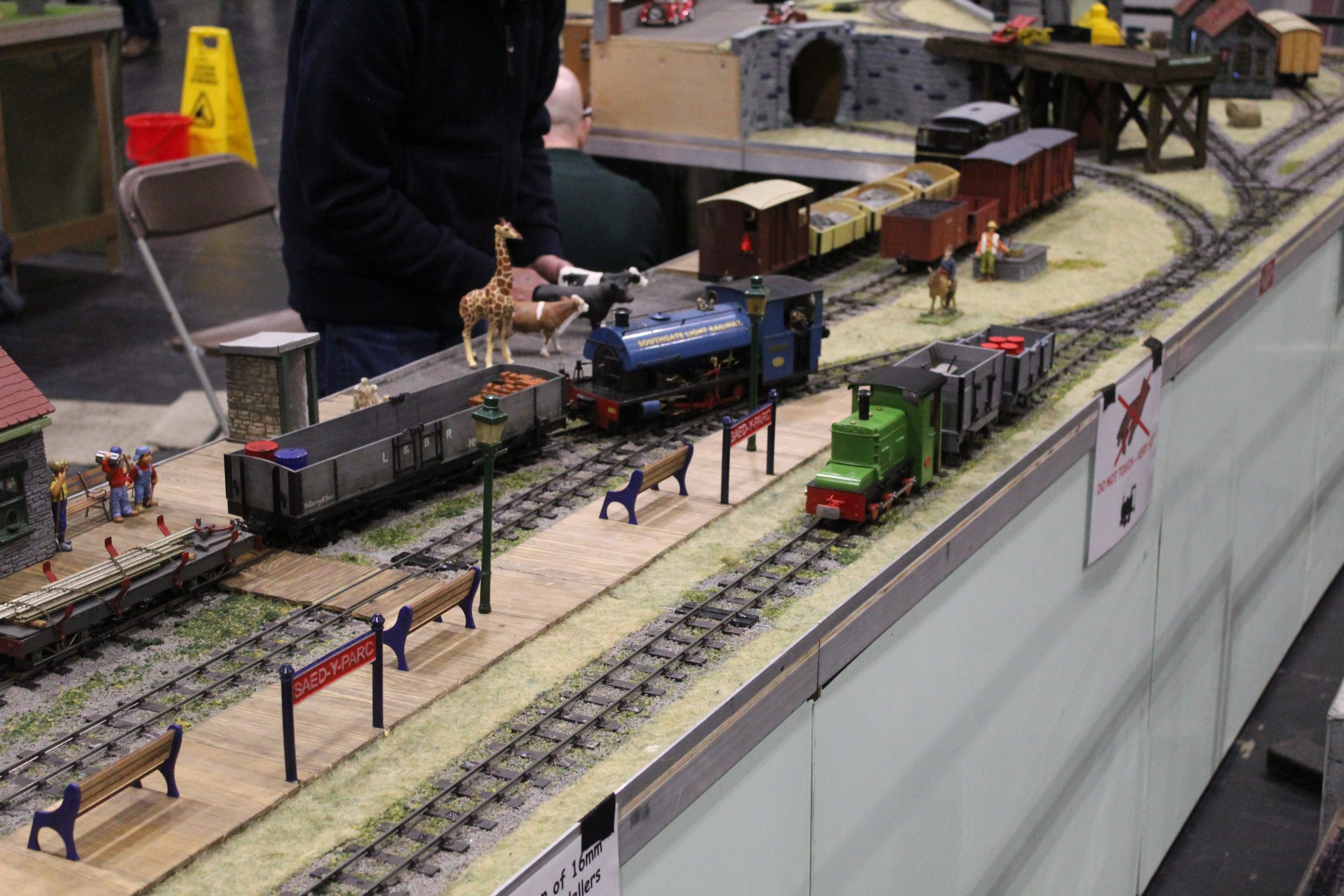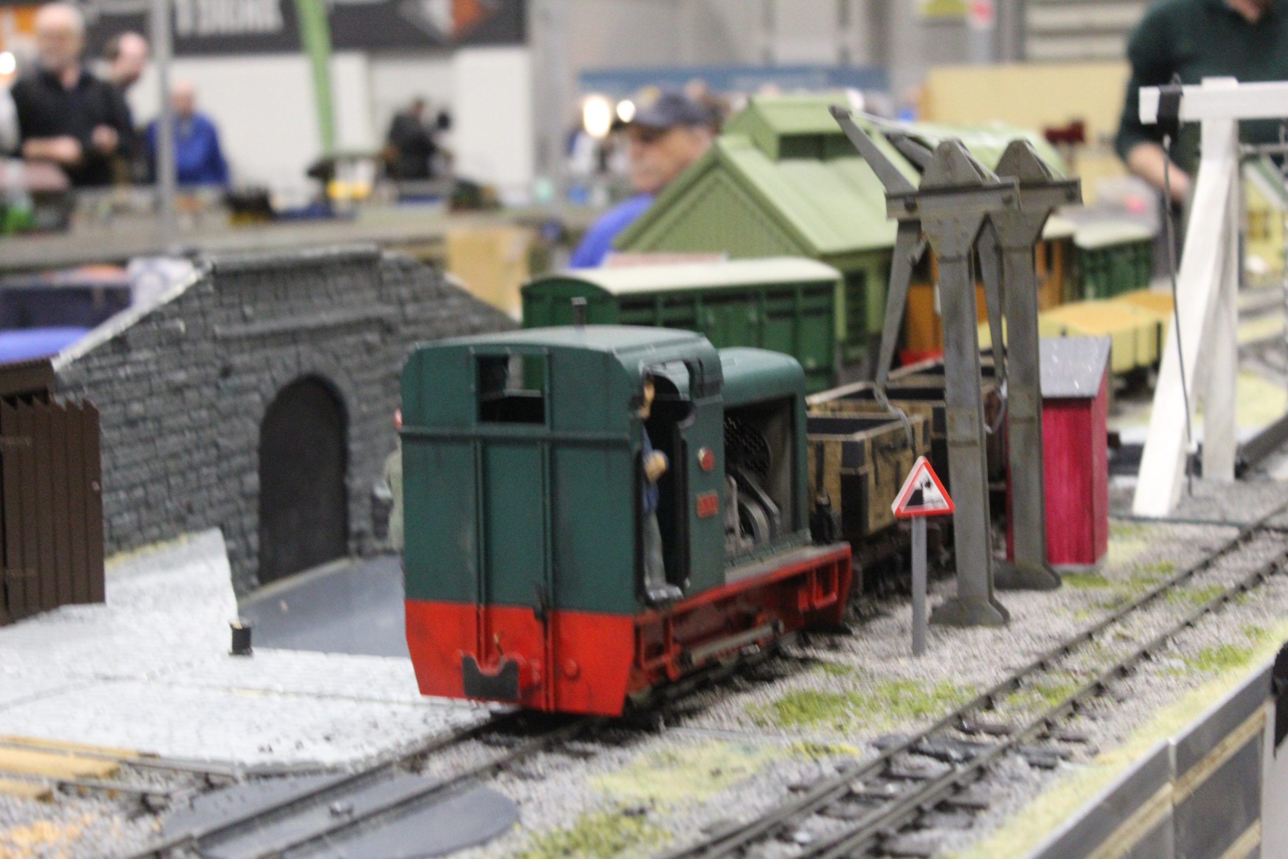 As always with this layout, running was a mix of diesels and small steam locos. Some would make there way around the full layout, choosing which route to take to pass others. Others would man the layouts features, including the mine, dock and factory. We soon had many people around the layout, mainly as a good number of them had never seen 16mm scale at a show of this type before. We enjoyed seeing the even more surprised look when we pointed out that it’s real steam coming out of that chimney!
