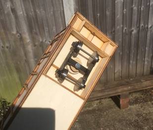 I then did my best effort at the lining with a Bob Moore pen, gold on the sides and cream on the ends, and fitted the roof, which I painted grey. The glazing was fitted and the lamp holders installed on top.