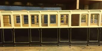 Then the painting started. I use Phoenix Grey primer all over which really helps to fill any grain in the ply. The interior was stained. This was followed by masking the side in half, and painting the top Phoenix FR carriage cream and the lower half LNWR Plum, three coats of each. The ends are gloss black.