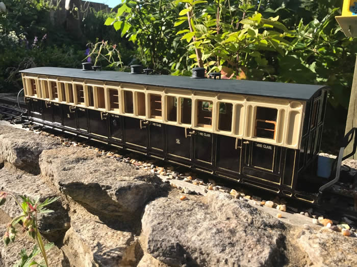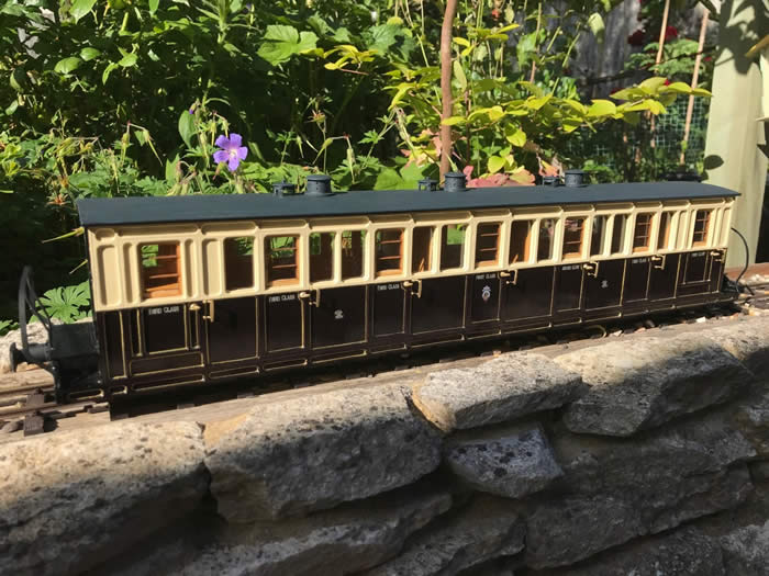 The end balconies were then made up and the seating fitted. I trial fitted the bogies at this stage. These were made by Andy Cooper (thanks Dad!) using IP small wheels, to an old David Hardy (Locomotion) design that works really well. They replace the wooden bogies provided in the kit.