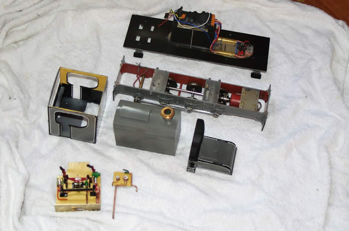 The photo shows the principal assemblies; the footboard with batteries, chassis, cab, bonnet, radiator/transmission bonnet and cab details.