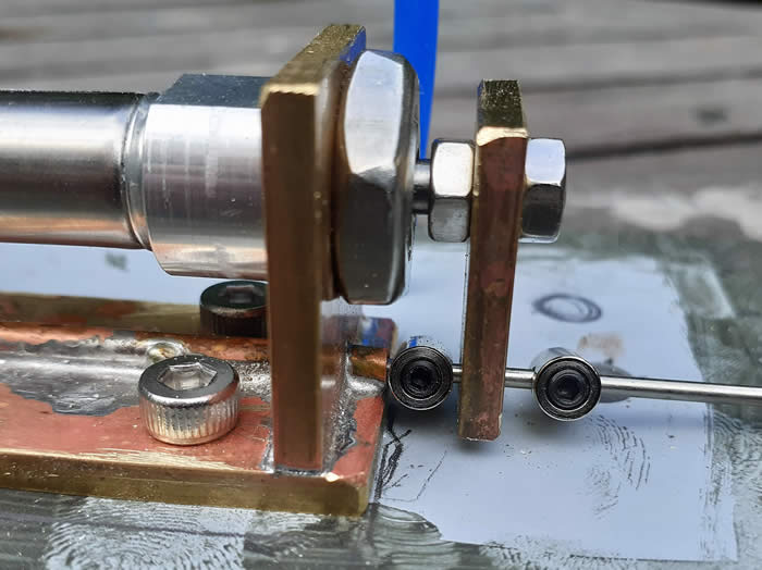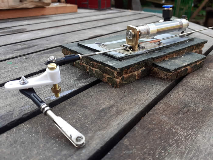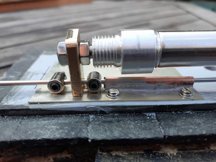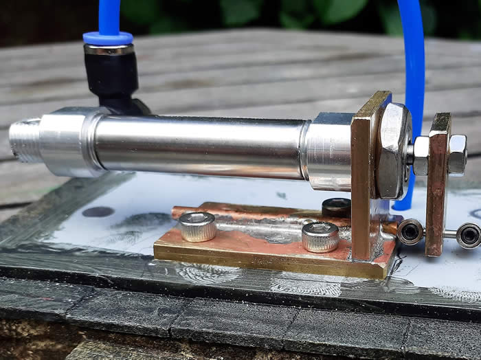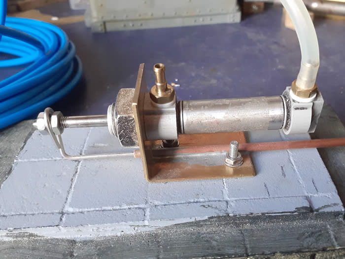 Point Motor Number Three. This point motor is in a difficult location under a lift up step, due to lack of space I had to locate it away from the point. The cylinder is mounted by a M3 screw and bush in the hole in the cap end. To the piston road a brass plate is fitted which slides on a nickel silver plate bolted to the base. To this plate a copper tube is soldered to guide the point rodding. Either side of the brass plate are two bobbins grub screwed onto the rodding, these can be adjusted to give the correct throw to open and close the switch blades.