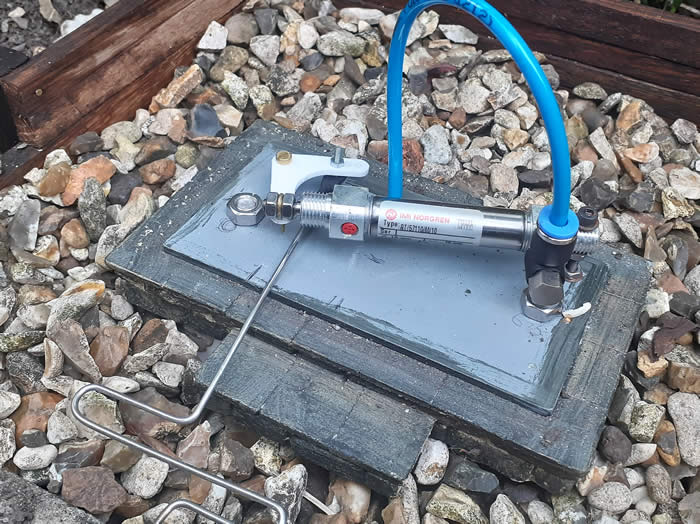 The Prototype Point Motor has the cylinder fixed on a mounting bracket using the M10 x 1mm pitch thread on the cylinder nose. A guide tube is soldered to the mounting bracket and a stainless-steel welding rod Is connected to the piston rod. Problem with this design is the rodding has to turn through 90 degrees to operate the point. At this point I discovered the range of M2 radio control fixing from Cornwall Model Boats, this includes threaded rodding, clevis’s, rose joints, connectors and bell cranks. I quickly adopted this for my rodding. At the location for the bell crank need to turn the rodding through 90 degrees, a length of 15mm copper pipe was driven into the ground, on top of this an air vent fitting was fitted which had been tapped 6BA to suit the bell crank mounting screw. The point being operated is by PECO, I used a clevis with the pin removed and the hole opened up, this then clips over the pip on the PECO tie bar.