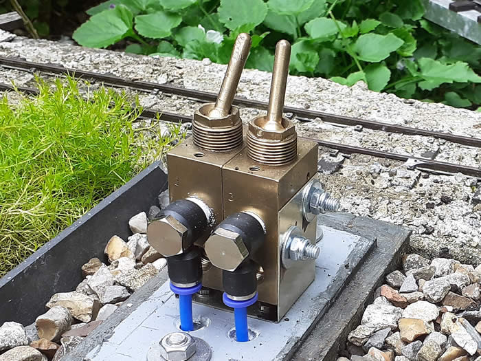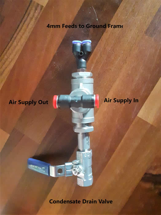 The supply from the compressor is by a 6mm nylon air pipe this runs to a distributor; one is provided for each ground frame location. The distributor is made up from ½ BSP stainless steel Tee fittings, mainly because I had these to hand. A 6mm Tee feeds air into the distributor and then feeds the next ground frame down the line. From the distributor 4mm pipes feed supplies the ground frame. The size of the distributor also acts as a mini air receiver storing air for the ground frame if multiple switching’s are carried out in a short space of time.