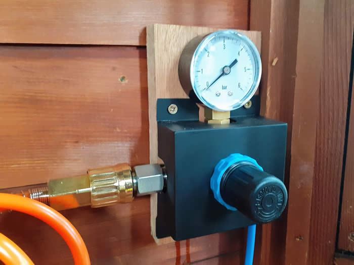 The compressor needs to be dry and away from the elements. In my system the compressor is in the summer house where it’s under cover and there is a power supply, the compressor I have was supplied with a hose using PCL XF type fittings. As I had a regulator to hand, I Installed this permanently into the summerhouse which connects to the compressor by this hose. This means I can set the system pressure without adjusting the regulator on the compressor and therefore doesn’t need resetting if the compressor is used elsewhere.