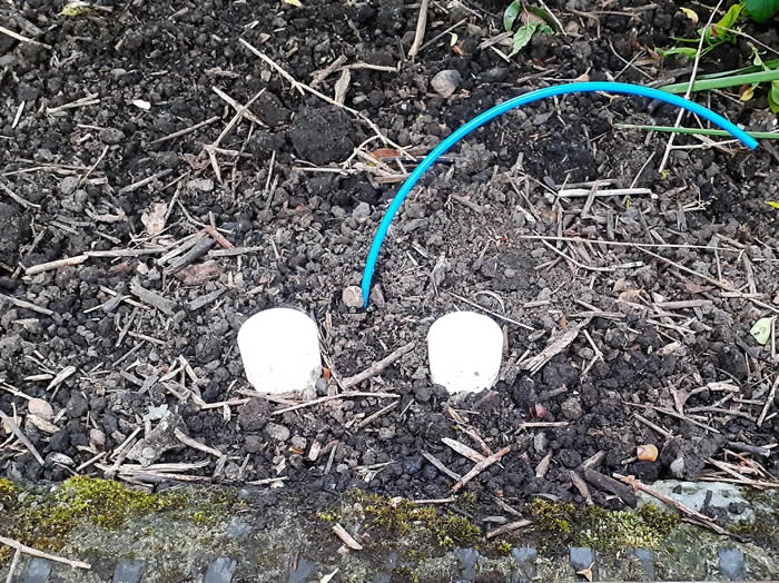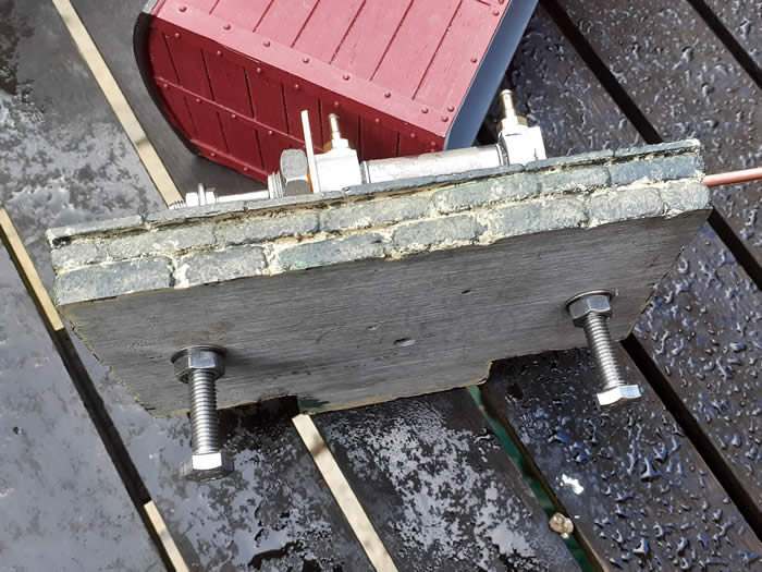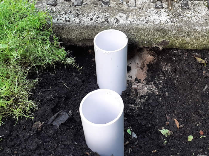 Both the ground frames and the point motors use the same system for mounting. The foundations for the bases consist of two 42mm diameter PVC waste pipes around 400mm long, these are driven into the ground until firm and level. The inside of the pipe is tamped with an old broom handle, then a watery cement mix is poured into the pipe. The grounded bodies base is drilled for two 6mm stainless coach bolts these are secured to the base with nut either side and the base is pushed into the cement with a little agitation to settle the mix and left to set. Once set the base can be removed from the foundation when required by undoing the nut on the top of the base.