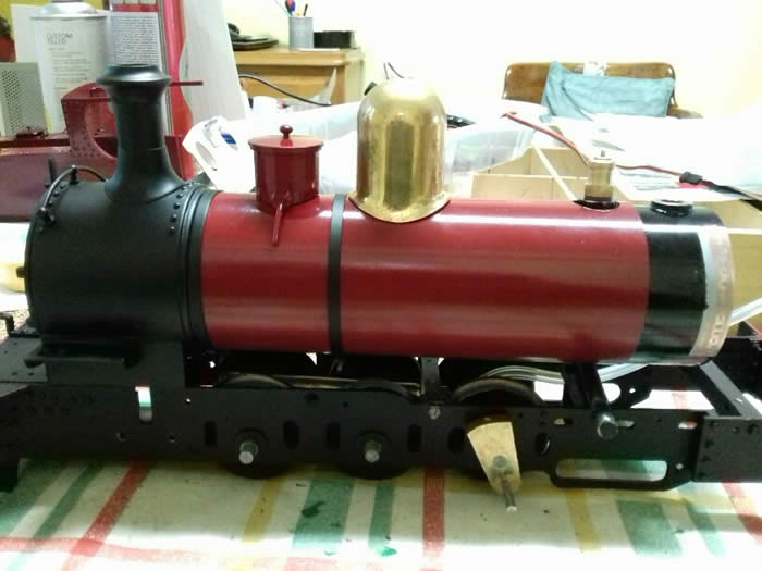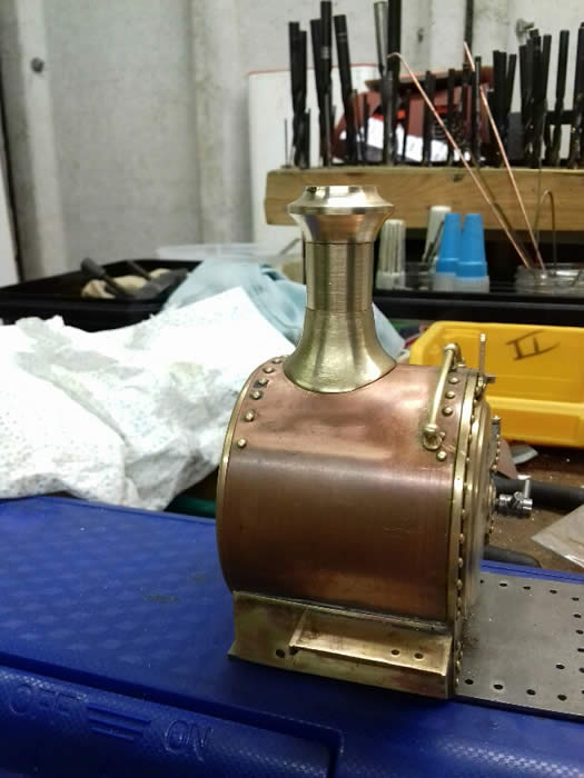 Russell’s boiler parts [ on the right ] were completed in 2019, soldered together at Charminster LR, and tested in early 2020. It is 2.25 inches in diameter and has four bushes; the front bush is the sand dome which conceals a Goodall-type filler valve; the second bush is the steam dome; the third is for the safety valve and the nearest one is the steam turret for the regulator.