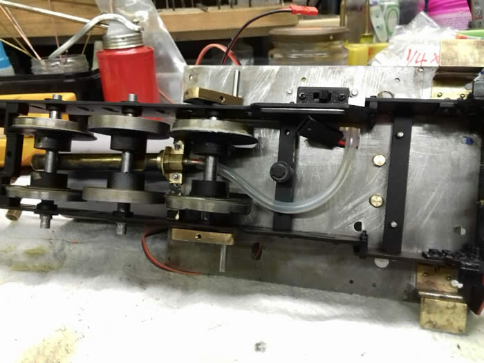 This picture shows the rear sand pots with dummy coal loads. The coal load on the right hand side is removable. Underneath is a Roundhouse D type gas tank. The servo for the reversing gear is in the left hand side tank along with the receiver and switch.