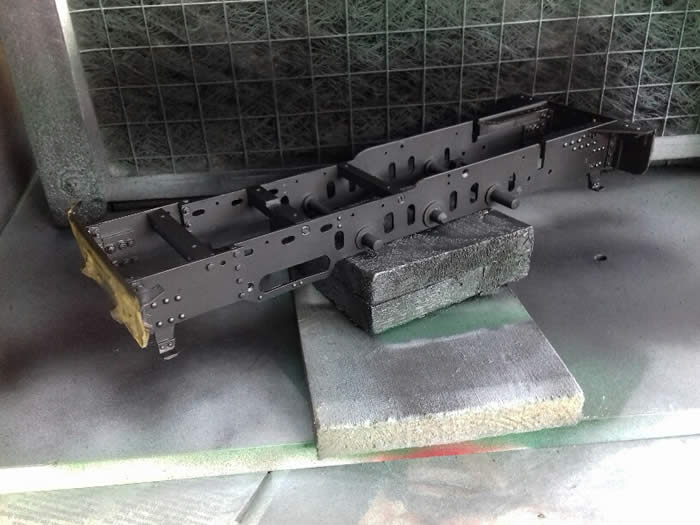 I found Russel’s frames hard to make because of all the changes in levels and the many holes! This view shows them being painted satin black.