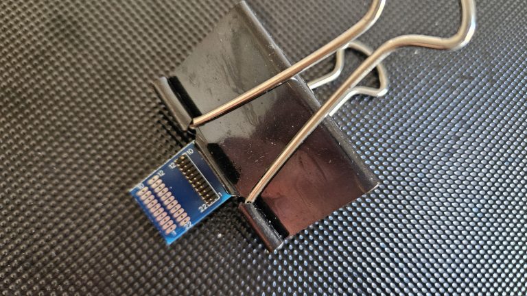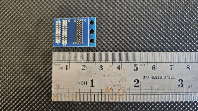 Mounting the chip is a case of gently aligning its 21 pins (which are very, very fine,) with the 21 holes in the Breakout Adaptor. A magnifying glass and steady (static free) hands are required until you get used to the process, after which it’s quite easy.
