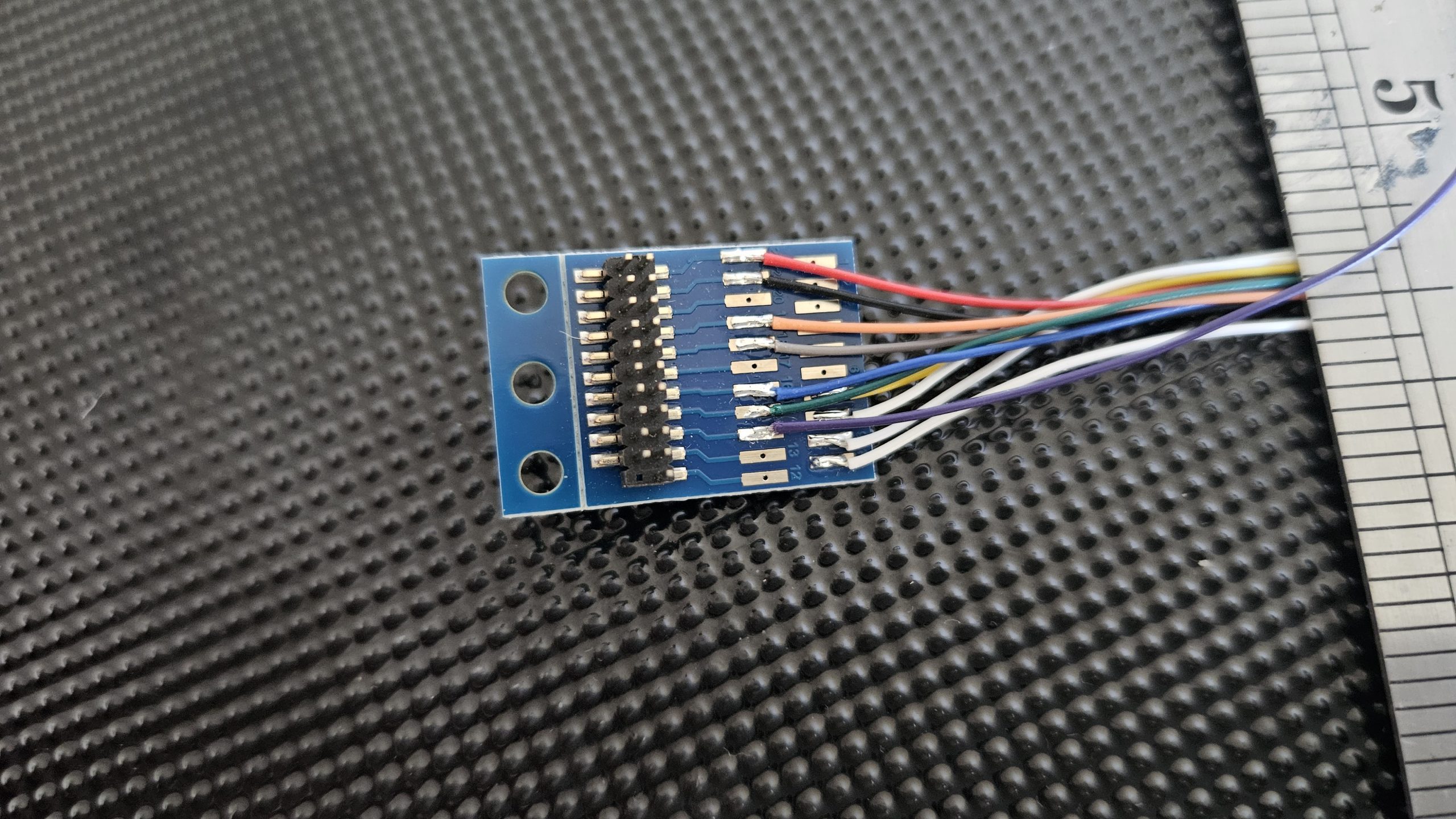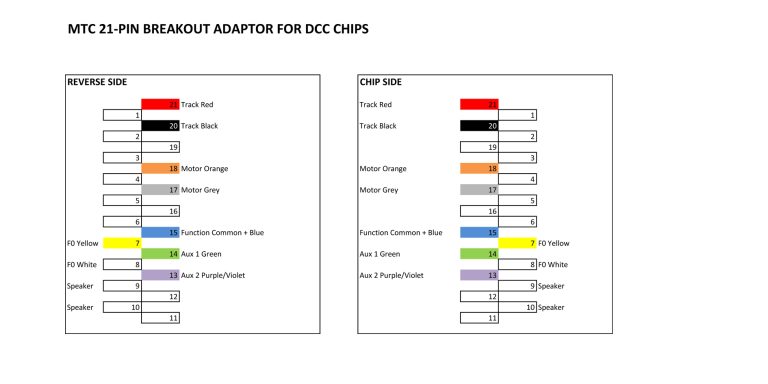 To get our loco to “see” the chip, we have to connect the relevant wires in the loco to the 21 solder pads on the Breakout Adaptor… but which wire goes where?