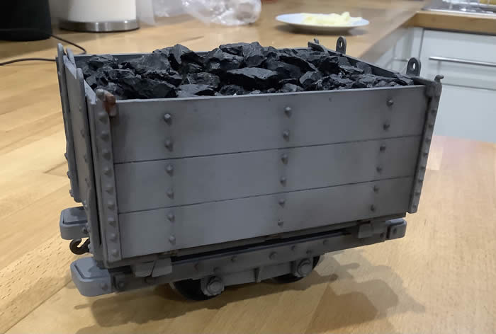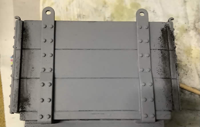 Take a good brushful of the powder ( this is a Sand Hutton coal wagon so I am using mostly black), brush onto the inside of the wagon, then along the edges of opening doors, along rivet lines, on the top of the chassis, anywhere, in fact, you think muck might accumulate.