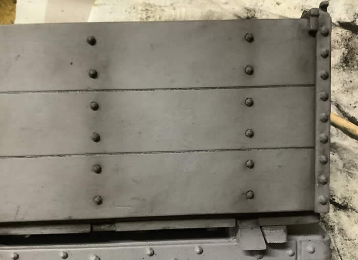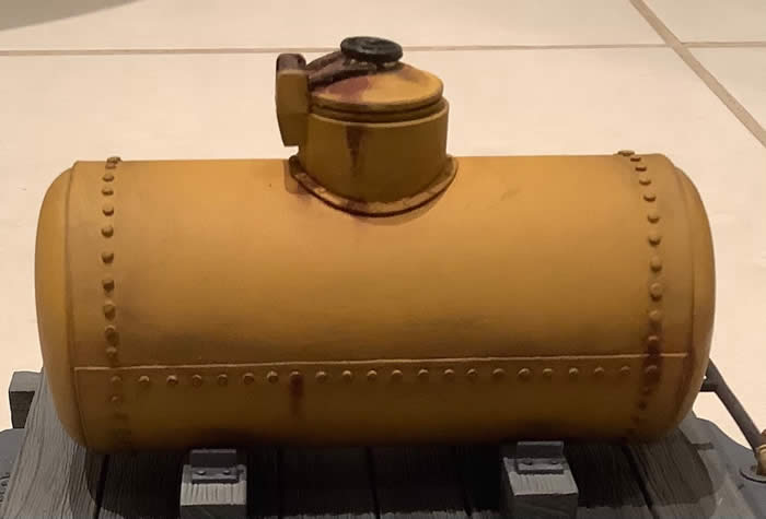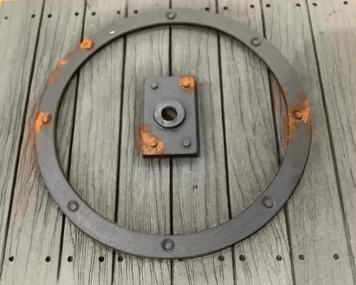 Weathering powders are also great for producing rust effects. I use two colours of rust powder, one dark and one light. Dip the tip of a fine paintbrush into matt varnish then into the darker rust powder. Take the excess off on a piece of card then stipple onto the area to be rusted. This will give the effect of old rust. Now do the same with the lighter rust powder to give the effect of fresh rust coming through. The picture will show what I mean.