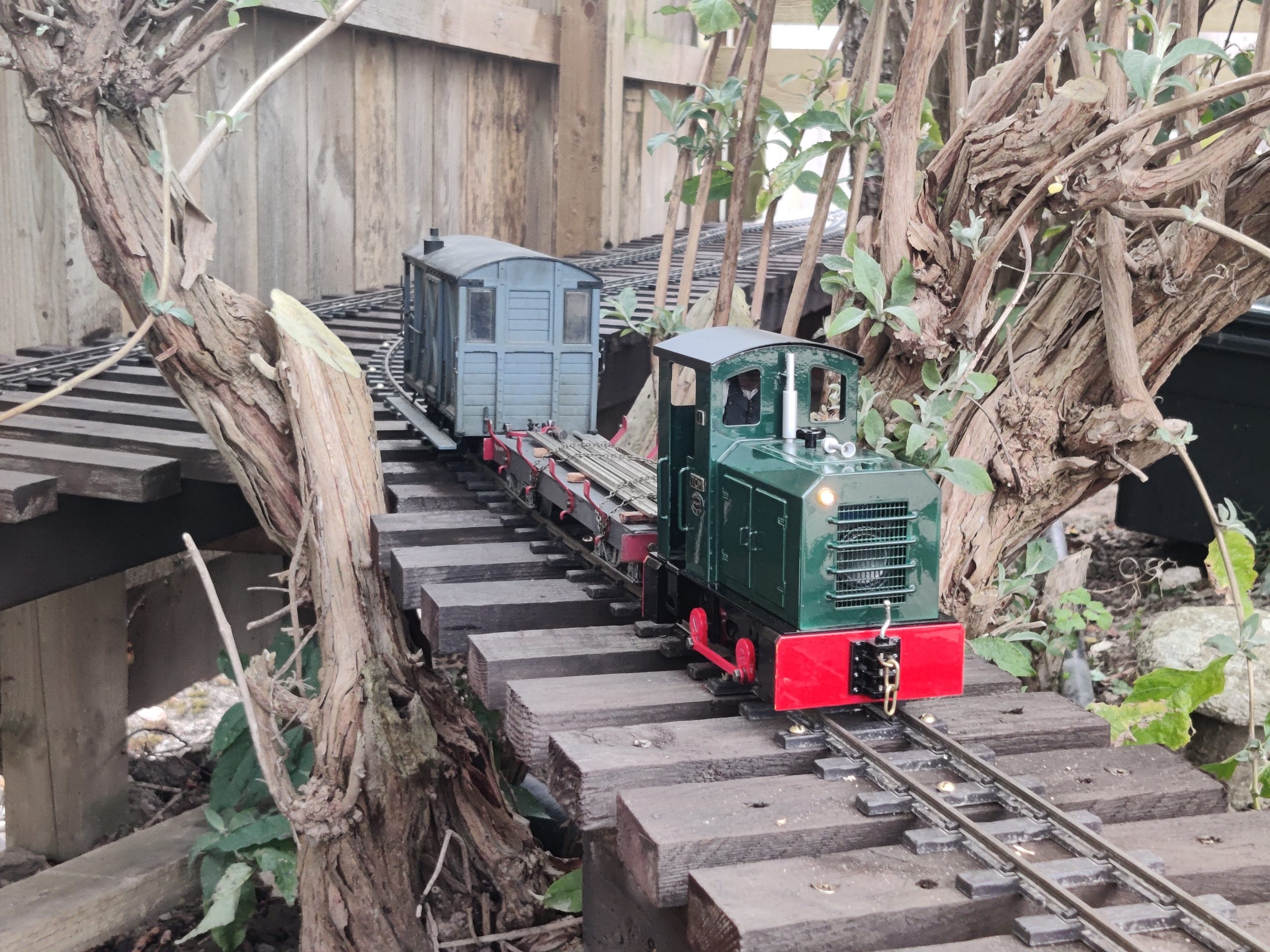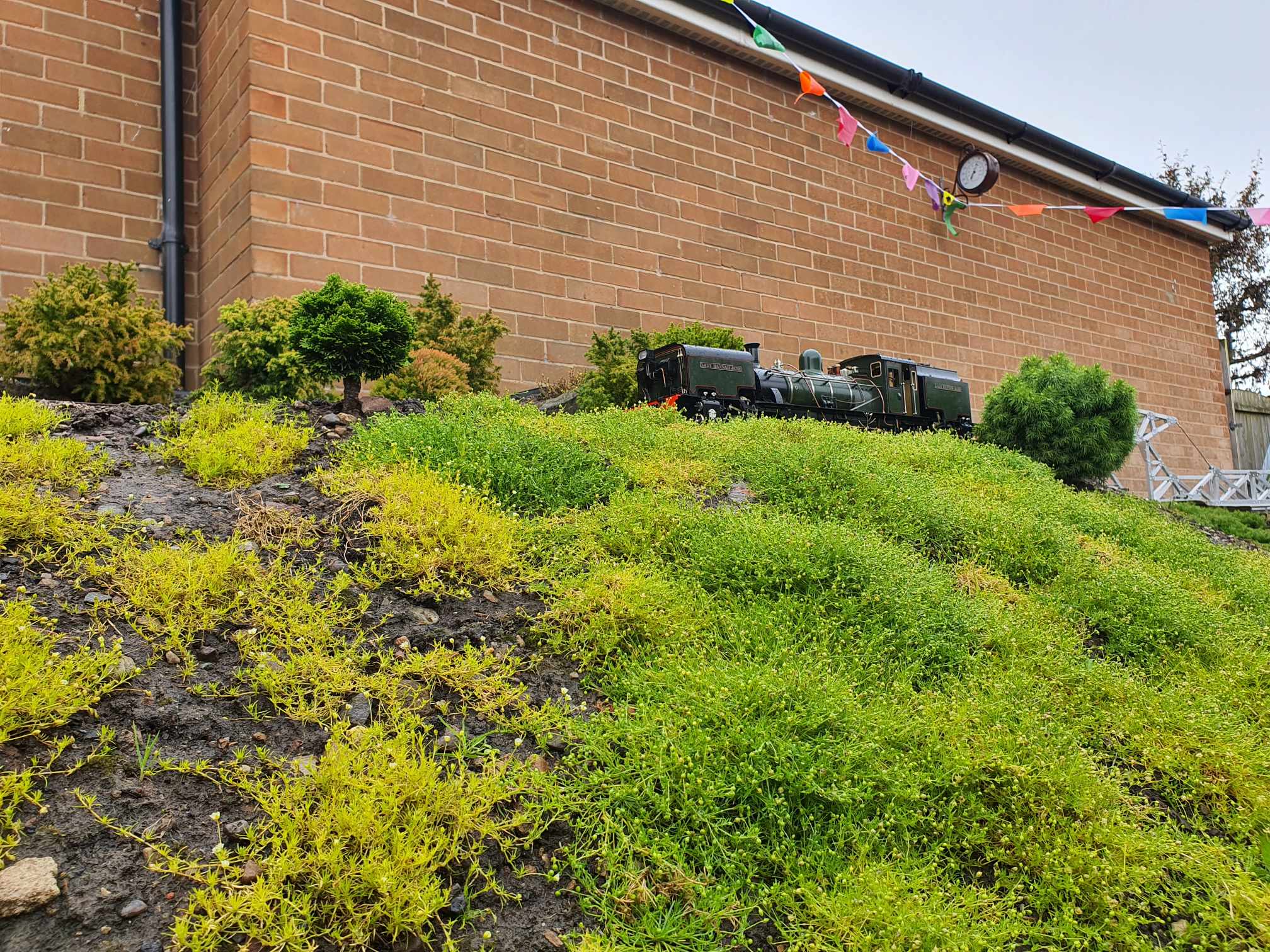 While the main loop is flat, we do now have an extension which raises up on a 1/50 gradient, giving locos a chance to chuff up the bank past our seating area.