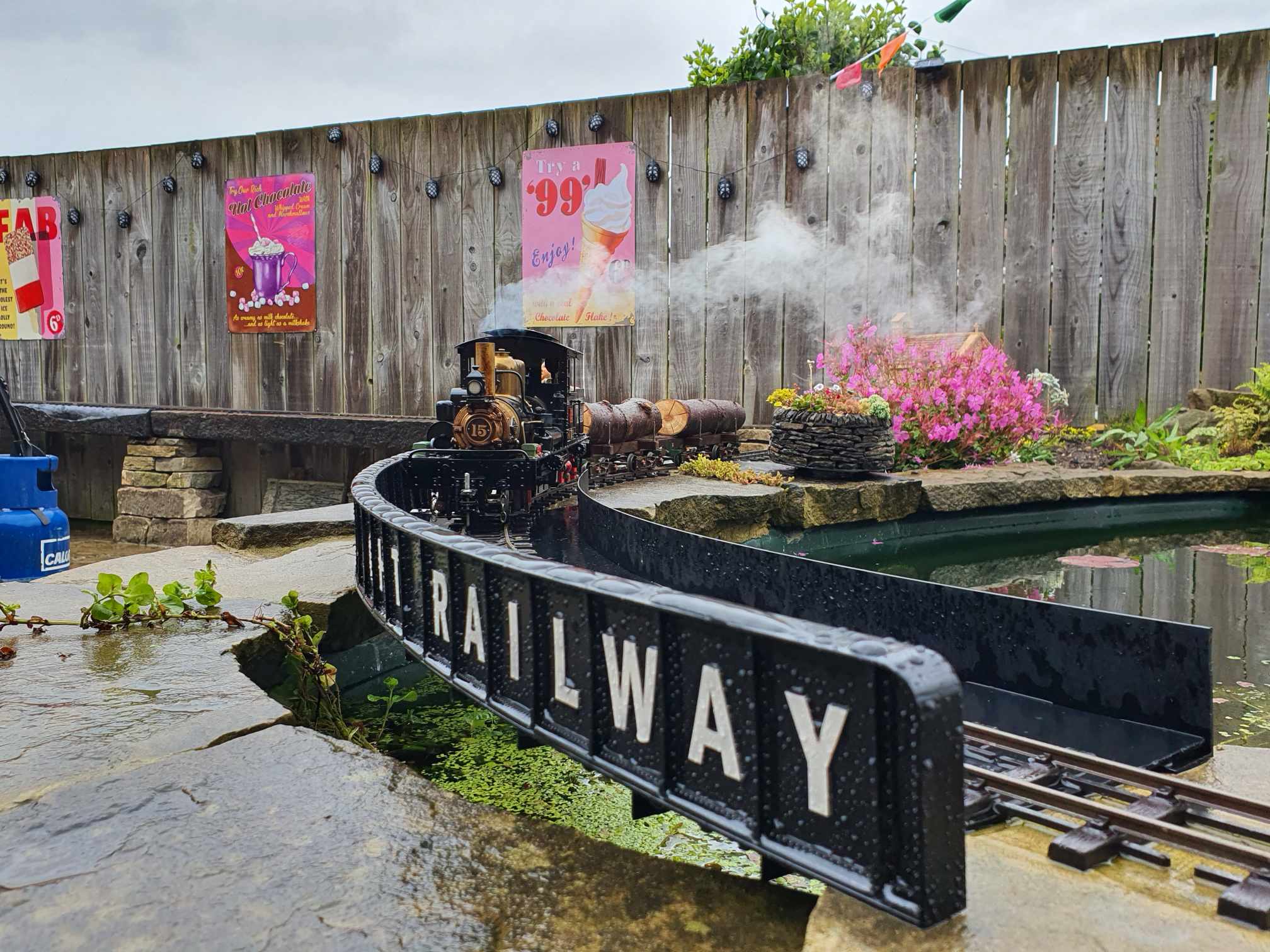 The railway is raised, with steam up areas set at both standing and sitting heights. However, it was built with the aim of integrating the railway into the garden, which can often be hard to achieve on raised lines. The use of banks around the line blends the track level into the garden.